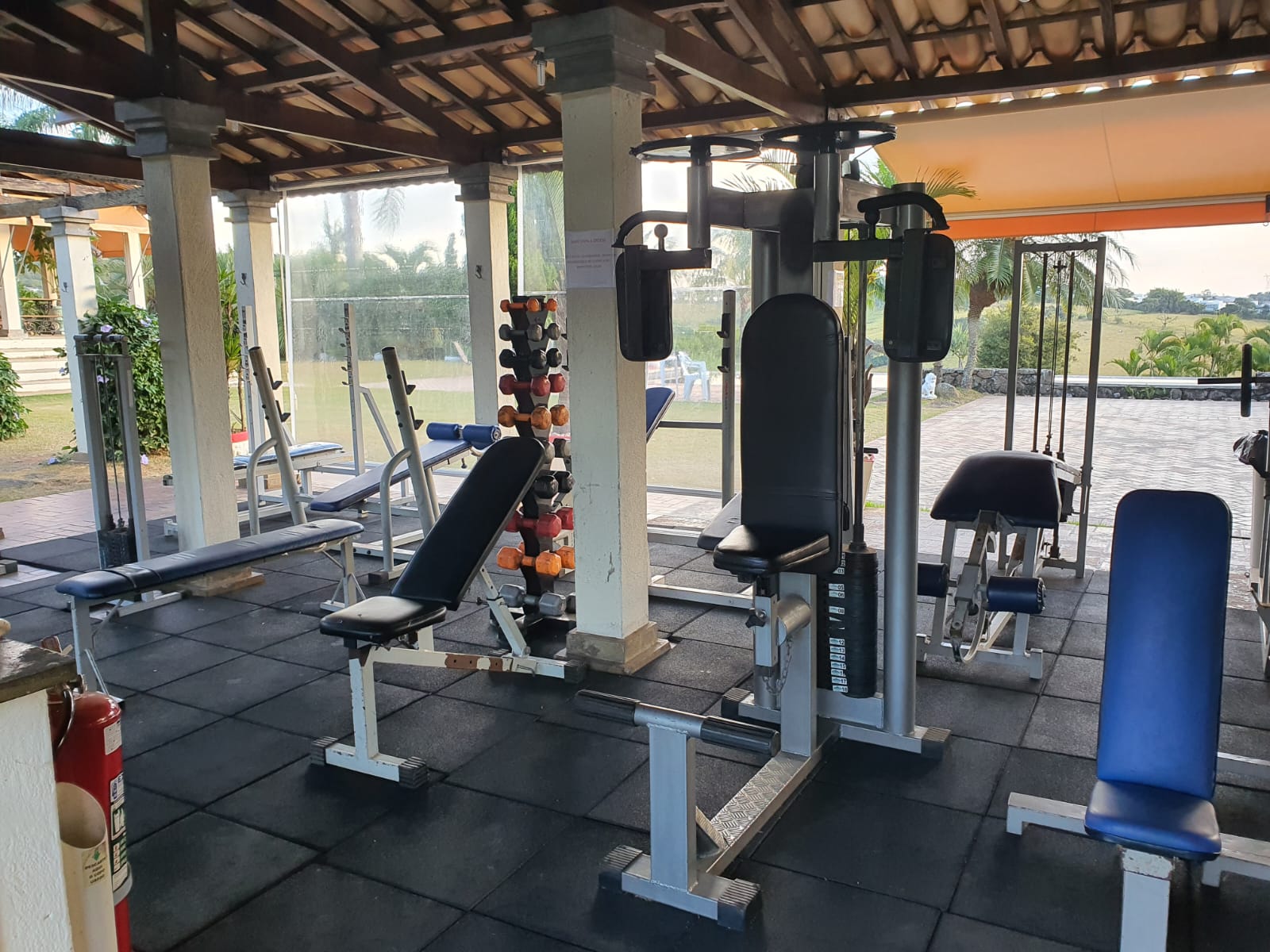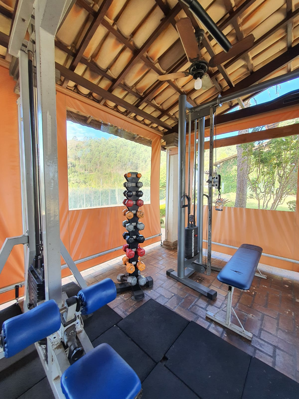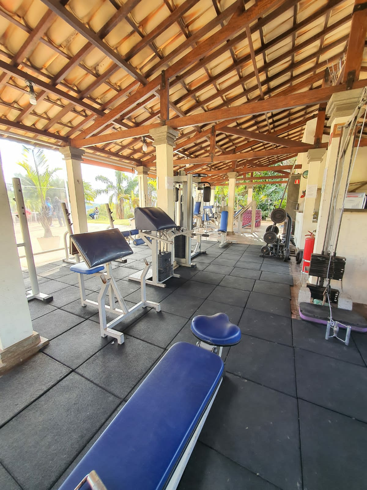 Ambientes equipados com piscina, academia, campo e quadra para esportes, refeitório, além de uma área ampla.